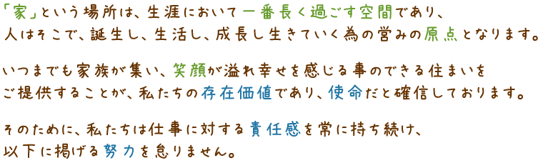 自分だけの自己満足だけでは、本当にお客様への満足を提供する事はできません。 - 私たちは、お客様、社員、協力業者の幸せを実現させる事を目的とするため日々、時代の変化に順応し、